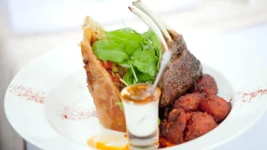 Similarly, the Lobster Tail with Saffron Risotto offers a burst of color and texture that mirrors the indulgence of the flavors within. The tender lobster, perfectly cooked and nestled atop a bed of creamy risotto, is garnished with vibrant microgreens and a delicate drizzle of lemon butter sauce. The golden hue of the saffron, the crimson of the lobster, and the green of the herbs tell a visual story of luxury, elegance, and the delicate balance of flavor profiles.