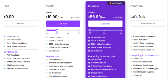 - Starter Plan: This plan is for content creators and small businesses. It offers 1500+ AI avatars, 2000+ video templates, 1380+ voices, and 3 Avatar Lite. It costs $26/99 per month.